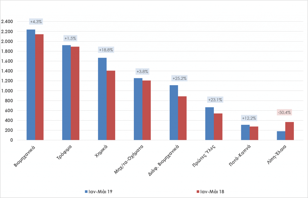 Σε κλαδικό επίπεδο, σημαντική συνεισφορά στην ανοδική πορεία των ελληνικών εξαγωγών είχαν οι εξαγωγές χημικών και διαφόρων βιομηχανικών προϊόντων (αύξηση κατά €263,9 εκατ., ήτοι 18,8% και €224,1 εκατ., ήτοι 25,2% αντίστοιχα), ενώ και οι εξαγωγές πρώτων υλών αυξήθηκαν κατά €125,0 στο α’ πεντάμηνο 2019, συμβάλλοντας στην ενίσχυση των εξαγωγικών μας επιδόσεων. Παράλληλα, αύξηση σημείωσαν οι εξαγωγές βιομηχανικών προϊόντων (€92,4 εκατ., ήτοι 4,3%), τροφίμων (€28,4 εκατ., ήτοι 1,5%), μηχανημάτων-οχημάτων (€45,4 εκατ., ήτοι 3,8%) και ποτών-καπνών (€33,8 εκατ., ήτοι 12,2%). Αντίθετα, οι εξαγωγές λιπών και ελαίων μειώθηκαν κατά €184,4 εκατ., ήτοι 50,4% συνεχίζοντας την έντονα καθοδική τους πορεία.