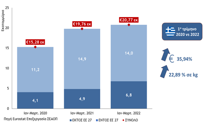 Ειδικότερα , το 1ο τρίμηνο 2022 σε σύγκριση με το αντίστοιχο του 2021, εμφανίζεται αύξηση σε αξία +5% (+€ 1,0 εκ.) και σε ποσότητα 15% (+1,2 εκ. κιλά). Ενώ σε σύγκριση με το 2020 εμφανίζεται αύξηση σε αξία »36% (+€ 5,5 εκ.) και σε ποσότητα »23% (+1,6 εκ. κιλά)