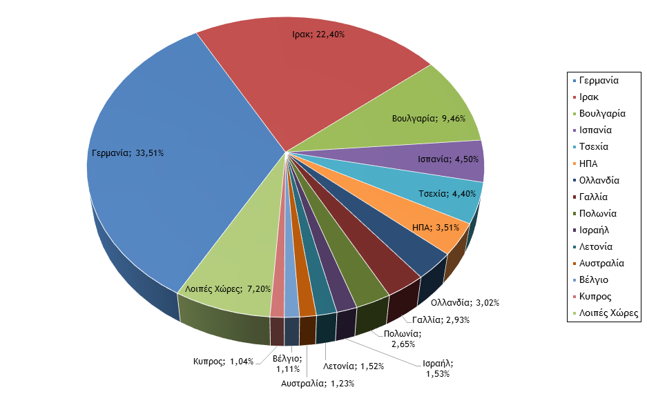 H Ευρώπη συνεχίζει να κατέχει σταθερά το μεγαλύτερο μερίδιο των εξαγωγών, σε ποσότητα & αξία με ποσοστό »68%. Με τη Γερμανία να αποτελεί την χώρα με το μεγαλύτερο μερίδιο εξαγωγών κατέχοντας το 41,4% της ποσότητας & το 33,5% της αξίας του συνόλου των εξαγωγών.