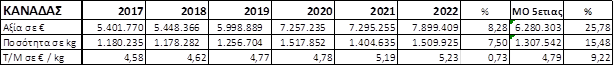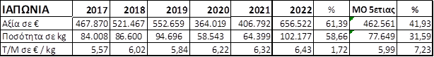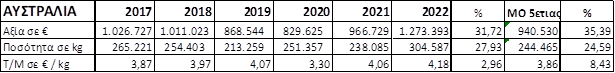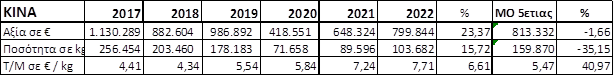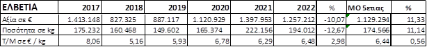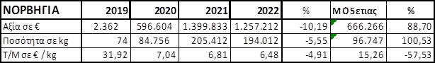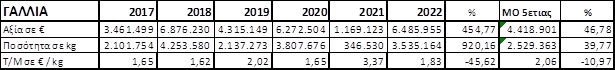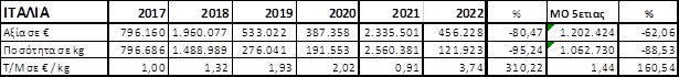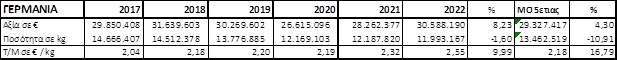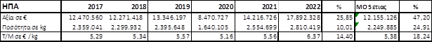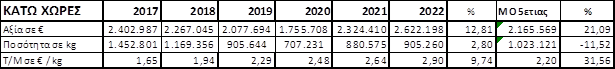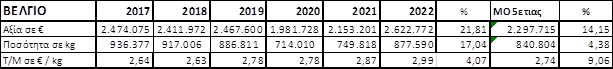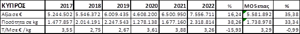 Αντίστοιχη ήταν και η μεταβολή των μεγεθών σε σύγκριση με την προηγούμενη 5ετία, αφού το 2022 σε σύγκριση με την 5ετία 2017 – 2021 παρουσίασε αύξηση της τάξης του 46,78% σε αξία και αύξηση επίσης κατά 39,77% σε ποσότητα. Η μέση τιμή μονάδος ανά kg μειώθηκε κατά 10,97% (ΜΟ 5ετίας: 2,06 €/kg – 2022: 1,83 €/kg)