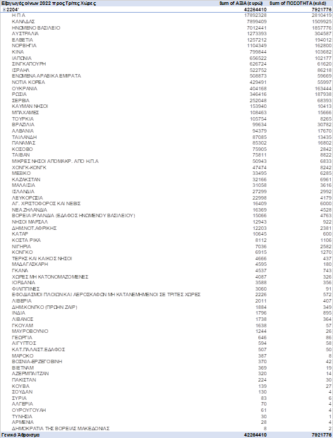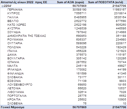 Ακολουθούν πίνακες των χωρών εξαγωγής των ελληνικών οίνων για το 2022 ανάλογα με τον προορισμό σε ΕΕ και Τρίτες Χώρες: