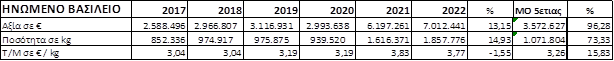 Όπως προαναφέραμε, ασφαλέστερη οδός της πορείας των εξαγωγών στην συγκεκριμένη αγορά, είναι η σύγκριση μεταξύ των ετών 2019/2022, σύγκριση σύμφωνα με την οποία εμφανίζεται αύξηση σε αξία κατά 1,05% και αντίστοιχα μείωση σε ποσότητα κατά 12,95%, μείωση που «συμβάλλει» στην άνοδο της μέσης τιμής πώλησης.