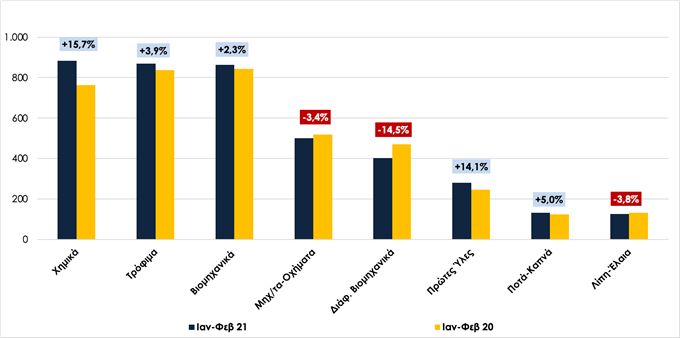 Αναφορικά με τους επιμέρους κλάδους και τη συνεισφορά τους στις ελληνικές εξαγωγές για το α’ δίμηνο του 2021, τα χημικά προϊόντα (με σημαντικότερη κατηγορία τα φαρμακευτικά) συνέχισαν την ανοδική τους πορεία (αύξηση €119,7 εκατ., δηλαδή 15,7%), ενώ αύξηση κατέγραψαν τόσο τα τρόφιμα (€32,2 εκατ., δηλαδή 3,9%), όσο και τα βιομηχανικά (€19,3 εκατ., δηλαδή 2,3%). Άνοδο σημείωσαν επίσης οι εξαγωγές πρώτων υλών (€34,6 εκατ., δηλαδή 14,1%) και ποτών και καπνών (€6,2 εκατ., δηλαδή 5,0%). Αντίθετα, σημαντική μείωση εξαγωγών παρατηρήθηκε στις εξαγωγές μηχανημάτων-οχημάτων (€17,4 εκατ., δηλαδή 3,4%), στα διάφορα βιομηχανικά προϊόντα (€68,3 εκατ., δηλαδή 14,5%), στα λίπη και έλαια (€5,0 εκατ., δηλαδή 3,8%) και στα μη ταξινομημένα προϊόντα (€11,4 εκατ., δηλαδή 14,5%).