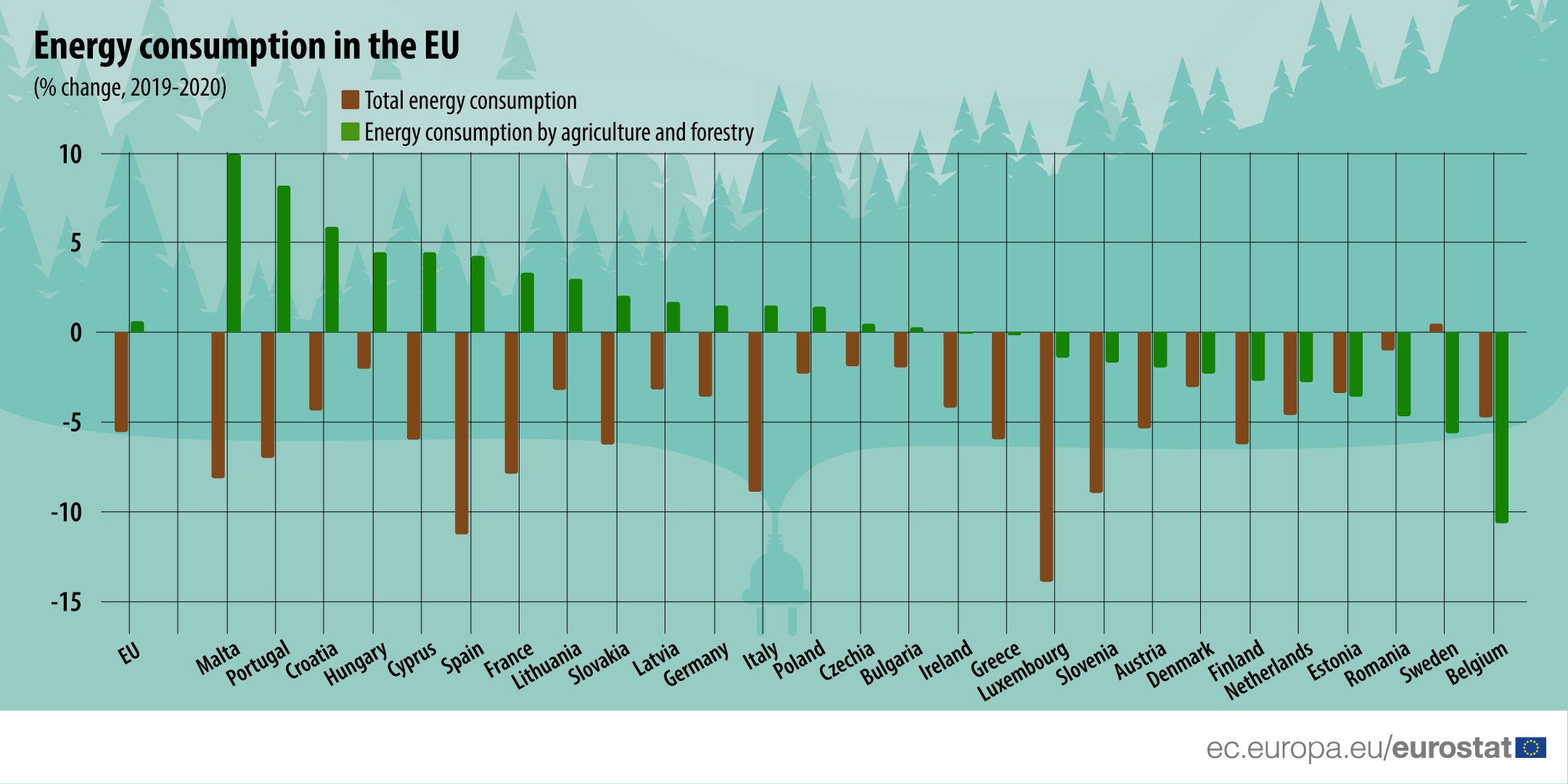 Με εξαίρεση τη Σουηδία (+1%), όλα τα κράτη μέλη της ΕΕ κατέγραψαν μειώσεις στη συνολική κατανάλωση ενέργειας το 2020 σε σύγκριση με το 2019. Οι πιο έντονοι ρυθμοί μείωσης αναφέρθηκαν στο Λουξεμβούργο (-14%), την Ισπανία (-11%) και Ιταλία (-9%). Στο άλλο άκρο του εύρους των μειώσεων, τα μικρότερα ποσοστά μεταβολής παρατηρήθηκαν στη Ρουμανία (-1%), την Ουγγαρία και τη Βουλγαρία (και οι δύο -2%). Ήταν μια διαφορετική ιστορία σχετικά με την ενέργεια που καταναλώνεται από τον τομέα της γεωργίας και της δασοκομίας. Υπήρξαν απότομοι ρυθμοί αύξησης σε ορισμένα κράτη μέλη μεταξύ 2019 και 2020, ιδίως για τη Μάλτα (+10%), την Πορτογαλία (+8%) και την Κροατία (+6%). Υπήρχαν επίσης ορισμένα κράτη μέλη για τα οποία μειώθηκε η κατανάλωση ενέργειας από τον τομέα της γεωργίας και της δασοκομίας.