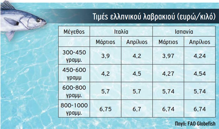 Σύμφωνα με το τελευταίο report του FAO Globefish, τον Απρίλιο, οι τιμές του ελληνικού λαβρακιού «τσίμπησαν» τα 30 λεπτά, με αποτέλεσμα στην ιταλική αγορά να διαμορφώνονται κατά μέσο όρο στα 4,20 ευρώ/κιλό για τα μεγέθη 300-450 γρ. και στα 4,50 για τα μεγέθη 450-600 γραμμαρίων. Τον ίδιο μήνα, οι μέσες τιμές στην ισπανική αγορά ήταν 4,24 και 4,54 ευρώ/κιλό αντίστοιχα. Για τα μεγαλύτερα μεγέθη, ωστόσο, δηλαδή από 600 γρ. και πάνω, που κατευθύνονται κατά κύριο λόγο στην εστίαση, οι τιμές δεν διαφοροποιήθηκαν σε σχέση με τον Μάρτιο, κάτι που, σύμφωνα με τους επιχειρηματίες του χώρου, εξηγείται από το γεγονός ότι «πρακτικά δεν υπήρχε αυτό το διάστημα το εν λόγω κομμάτι της αγοράς».