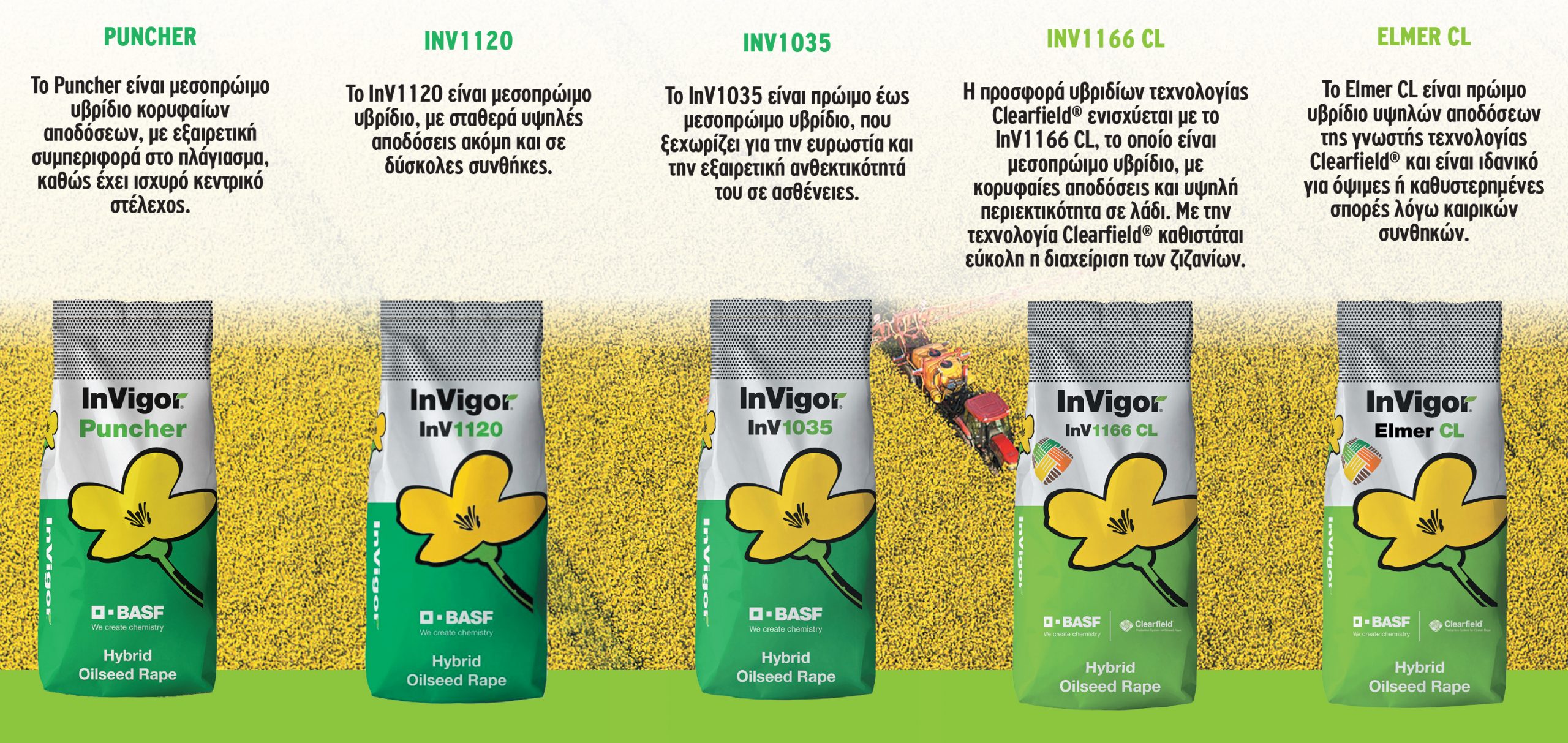 H BASF διαθέτει ένα ενισχυμένο χαρτοφυλάκιο υβριδίων ελαιοκράμβης InVigor® που περιλαμβάνει υβρίδια τεχνολογίας Clearfield® και ένα πλήρες χαρτοφυλάκιο προϊόντων φυτοπροστασίας, προσφέροντας ολοκληρωμένες λύσεις στην καλλιέργεια της ελαιοκράμβης.