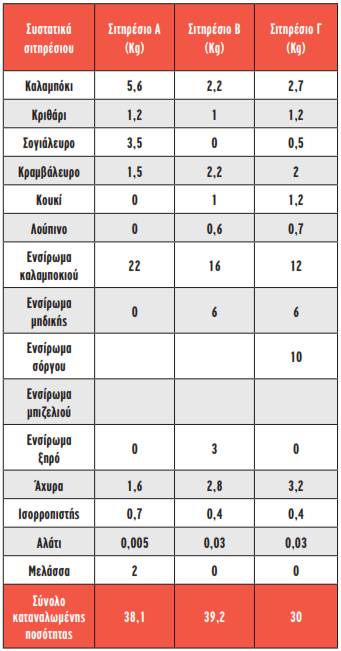 Το σύνολο των παραγόμενων προϊόντων χρησιμοποιήθηκε ως μείγμα ζωοτροφών για την κάλυψη διατροφικών αναγκών αγελάδων γαλακτοπαραγωγής. Στον πίνακα που παρατίθεται παρουσιάζονται τα τρία σιτηρέσια που δοκιμάστηκαν (Πίνακας 2).