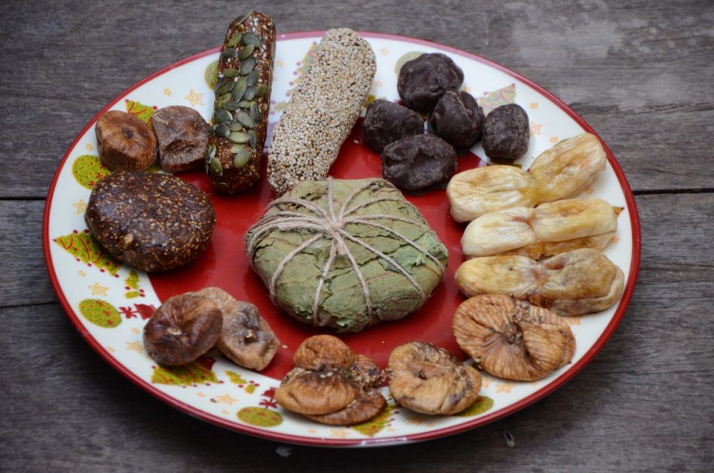 Η «συκομαΐδα» ή διαφορετικά συκόπιτα, γίνεται από ξερά σύκα, ζυμωμένα με μούστο ή ούζο, πιπέρι, σπόρους μάραθου και ξύσμα λεμονιού.