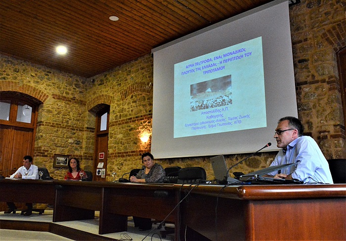 Η κ. Χειμωνοπούλου Μαρία βιολόγος-ιχθυολόγος, του Υδροβιολογικού Σταθμού Πέλλας και πρόεδρος του συλλόγου «Φίλοι του ποταμού Τριπόταμου Βέροιας» μίλησε για το ιστορικό του Υ.Σ.Πέλλας και τους ρόλους του, με έμφαση στην παρακολούθηση φυσικοχημικών παραμέτρων και αφθονίας ιχθυοπληθυσμών που πραγματοποιείται τα 2 τελευταία χρόνια στον ποταμό Τριπόταμο. Η φθίνουσα πορεία στον αριθμό (αφθονία) και στο μέγεθος των ενήλικων ατόμων είναι εμφανής με το πέρας του χρόνου, για αυτό το λόγο για το έτος 2018 υπάρχει καθολική απαγόρευση της αλιείας στο σύστημα του ποταμού Τριπόταμου από το Τμήμα Αλιείας Π.Ε. Ημαθίας. Λόγω του μικρού αριθμού ενήλικων ατόμων δεν κατέστη δυνατόν να πραγματοποιηθεί τεχνητή αναπαραγωγή άγριας πέστροφας στο ποτάμι από το προσωπικό του Υ.Σ.Π.. Η κ. Χειμωνοπούλου αναφέρθηκε στους λόγους για τους οποίους η άγρια πέστροφα κινδυνεύει (ΣΥΡΙΚΝΩΣΗ ΠΑΡΟΧΘΙΑΣ ΒΛΑΣΤΗΣΗΣ, ΑΛΙΕΥΣΗ (ΠΑΡΑΝΟΜΗ), ΑΣΤΙΚΑ ΛΥΜΜΑΤΑ, ΑΠΟΒΛΗΤΑ, ΦΕΡΤΑ ΥΛΙΚΑ (ΧΩΜΑ, ΙΝΕΣ) ΔΗΜΙΟΥΡΓΙΑ ΥΔΑΤΟΠΤΩΣΕΩΝ, ΑΠΟΠΛΥΣΗ ΓΕΩΡΓΙΚΩΝ ΕΔΑΦΩΝ, ΑΠΟΛΗΨΕΙΣ ΝΕΡΟΥ) και τόνισε, ιδιαίτερα για τον παραπόταμο Μαυρονέρι, τη σημασία παρουσίας παρόχθιας βλάστησης και την πραγματοποίηση αγροτικών δραστηριοτήτων τουλάχιστον σε απόσταση 5 μέτρων από κάθε όχθη υποχρεωτικά, όπως ορίζουν οι Κώδικες Ορθής Γεωργικής Πρακτικής. Η παρόχθια βλάστηση μειώνει την διάβρωση, διατηρεί καλή την ποιότητα του νερού και μειώνει τη θερμοκρασία του το καλοκαίρι, αυξάνει την βιοποικιλότητα και είναι καταφύγιο για τα μικρής ηλικίας ψάρια. Είναι εξαιρετικά σημαντικό να είναι σε καλή κατάσταση στον παραπόταμο Μαυρονέρι, καθώς είναι περιοχή ωοτοκίας για την άγρια πέστροφα.