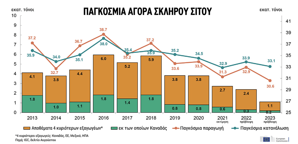 Ως εκ τούτου και με δεδομένο ότι η εκτίμηση για την ευρωπαϊκή σοδειά έμεινε ουσιαστικά αμετάβλητη στους 7,1 εκατ. τόνους, το IGC αναθεώρησε καθοδικά κατά σχεδόν 1 εκατ. τόνους την παγκόσμια παραγωγή, την οποία τοποθετεί τώρα στους 30,6 εκατ. τόνους, ήτοι 2,3 εκατ. τόνους κάτω από πέρυσι (μείωση 7,1%). Επί τα χείρω, αλλά σε μικρότερο ποσοστό (2,3% ή 0,6 εκατ. τόνοι κάτω σε σχέση με πέρυσι) αναθεωρήθηκε και η παγκόσμια κατανάλωση που οι αναλυτές του IGC εκτιμούν τώρα ότι θα κινηθεί στους 33,1 εκατ. τόνους.