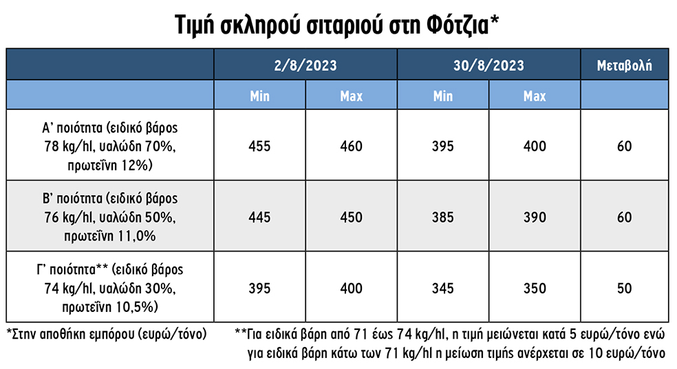 Η πλέον βίαιη διόρθωση, ωστόσο, καταγράφηκε την Τετάρτη 30 Αυγούστου στη Φότζια, όπου οι δύο πρώτες κατηγορίες έχασαν 60 ευρώ και η τρίτη 50 ευρώ/τόνο. Έτσι, η τιμή (αποθήκης επί αυτοκινήτου) για την πρώτη κατηγορία (ελάχιστο ειδικό βάρος 78 kg/hl, υαλώδη 70%, πρωτεΐνη 12%) διαμορφώνεται πλέον στα 395-400 ευρώ/τόνο, για τη δεύτερη κατηγορία (ειδικό βάρος 76 kg/hl, υαλώδη 50%, πρωτεΐνη 11%) στα 385-390 ευρώ/τόνο και για την τρίτη ποιοτική κατηγορία (ειδικό βάρος 74 kg/hl, υαλώδη 30%, πρωτεΐνη 10,5%) στα 345-350 ευρώ/τόνο.