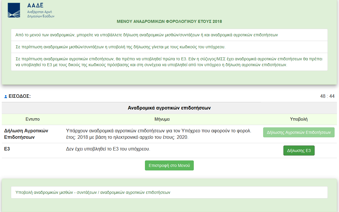Και κάνουμε υποβολή δήλωσης Ε3 και επιστροφή στο κεντρικό μενού. Επιστρέφοντας στο κεντρικό μενού πατάμε πάλι Δήλωση Αναδρομικών Μισθών/Συντάξεων/ Αγροτικών Επιδοτήσεων για να υποβάλλουμε το Ε1.