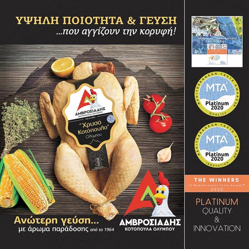 Την υλοποίηση πολυετούς έρευνας αποτελεί το «ΧΡΥΣΟ ΚΟΤΟΠΟΥΛΟ ΟΛΥΜΠΟΥ ΑΜΒΡΟΣΙΑΔΗ» που έχει αγκαλιαστεί από τους καταναλωτές. Ένα ιδιαίτερο κοτόπουλο, με διατροφή βασισμένη στο καλαμπόκι που έχει εμπλουτιστεί με λιναρόσπορο, ρίγανη και μείγμα αρωματικών φυτών. Η εκτροφή του είναι μελετημένη, προσεγμένη και προσανατολισμένη, ώστε το τρυφερό, ζουμερό και ιδιαίτερα γευστικό του κρέας να ικανοποιήσει και τους πιο απαιτητικούς γευσιγνώστες. Μέσα στο 2020 έχει λάβει δύο ανώτατες βραβεύσεις σε διεθνείς διαγωνισμούς. |