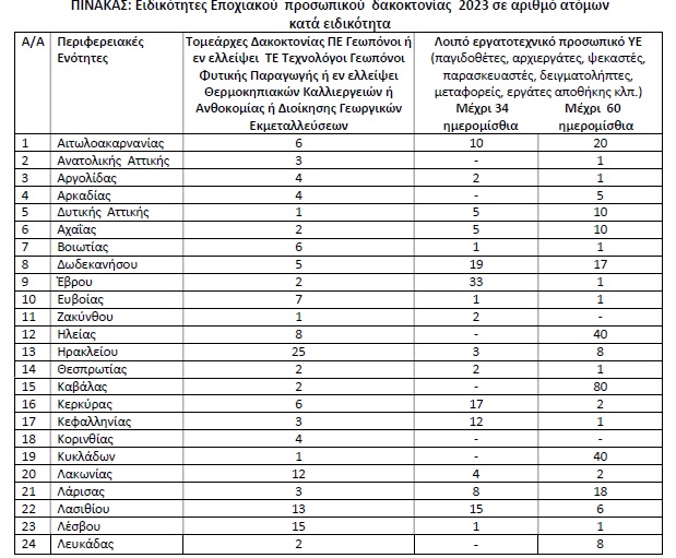 Πιο συγκεκριμένα και όπως αναφέρει η απόφαση του υπουργείου, για την αντιμετώπιση των εποχικών αναγκών στο πρόγραμμα καταπολέμησης του δάκου της ελιάς έτους 2023, κατανέμουμε στις κατωτέρω Περιφερειακές Ενότητες – Διευθύνσεις Αγροτικής Οικονομίας και Κτηνιατρικής της Χώρας, αρμόδιες υπηρεσίες για την εκτέλεση του ανωτέρω Προγράμματος, προσωπικό με σχέση εργασίας ιδιωτικού δικαίου ορισμένου χρόνου, ως εξής :