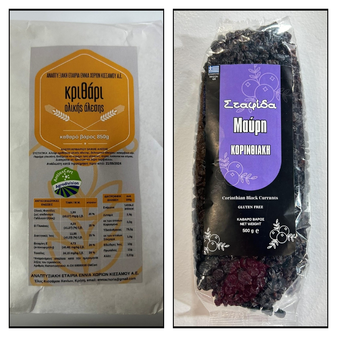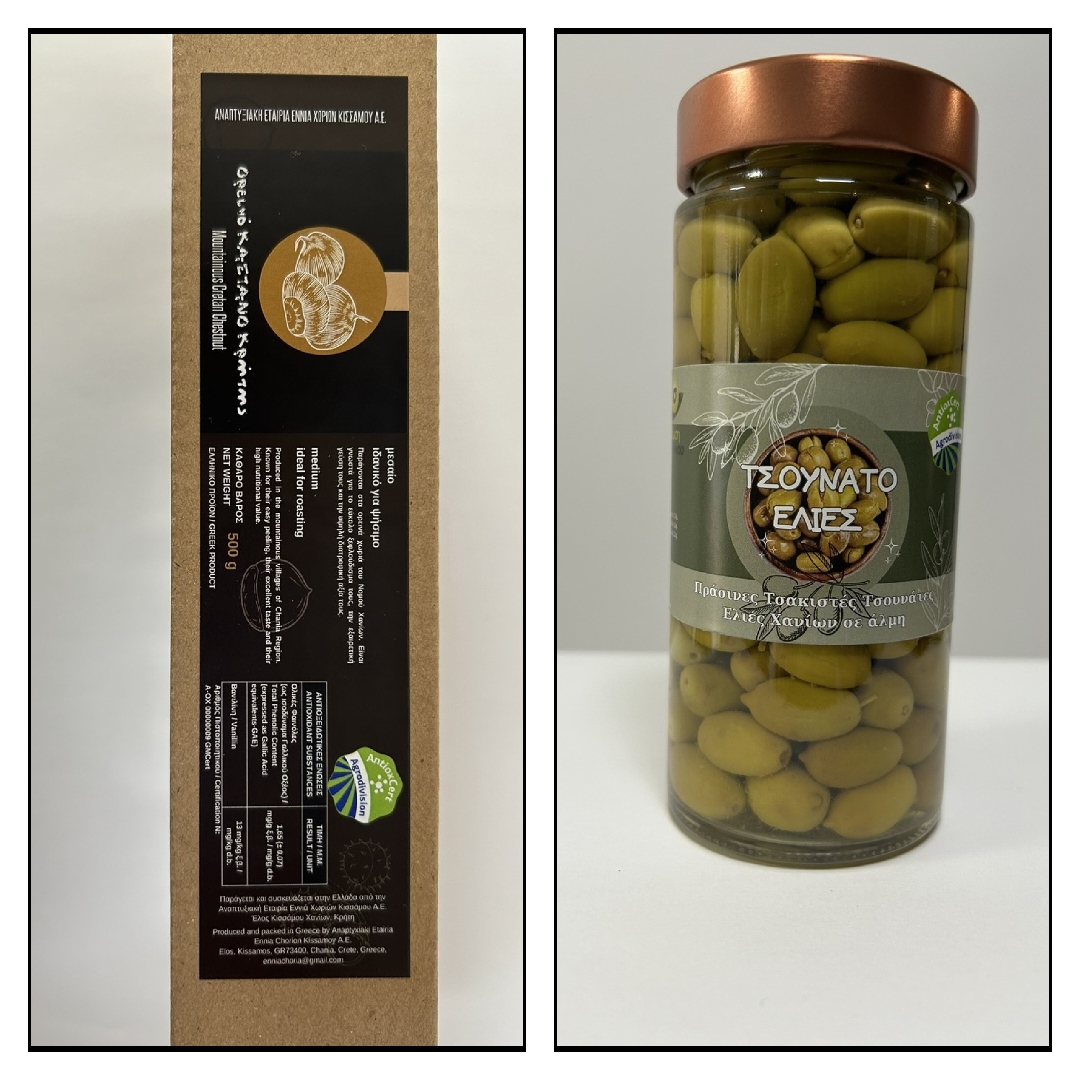 Ελαιόλαδο- ελιές Κρήτης, μέλι-τσάι-ρίγανη Χαλκιδικής, οίνοι Μακεδονίας, Κορινθιακή σταφίδα, κάστανο, κριθάλευρο Κρήτης και σκόδρα Ν. Βύσσας Έβρου