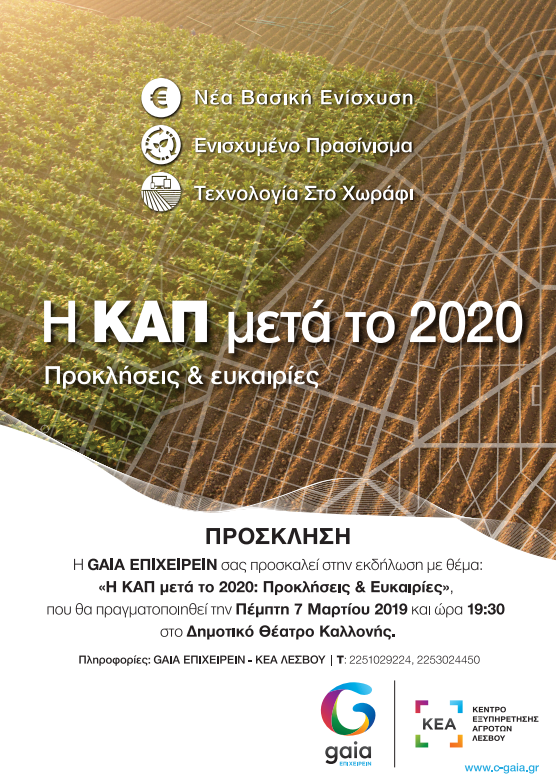 Mε αμείωτο ενδιαφέρον και σημαντική συμμετοχή του κόσμου, συνεχίζονται οι ενημερωτικές εκδηλώσεις που πραγματοποιεί σε όλη την Ελλάδα, από τον προηγούμενο μήνα, η GAIA ΕΠΙΧΕΙΡΕΙΝ. Οι εκδηλώσεις με θέμα «Η ΚΑΠ μετά το 2020: Προκλήσεις & Ευκαιρίες» διοργανώνονται με στόχο την ενημέρωση όσων σχετίζονται με την αγροτική παραγωγή για τα χαρακτηριστικά και τις ιδιαιτερότητες της Νέας ΚΑΠ, αλλά και τα σημεία που είναι ακόμα σε διαβούλευση, έχοντας ως απώτερο στόχο τη συμβολή όλων των εμπλεκομένων στη διαμόρφωση του Εθνικού Στρατηγικού Σχεδίου για την ελληνική γεωργία.