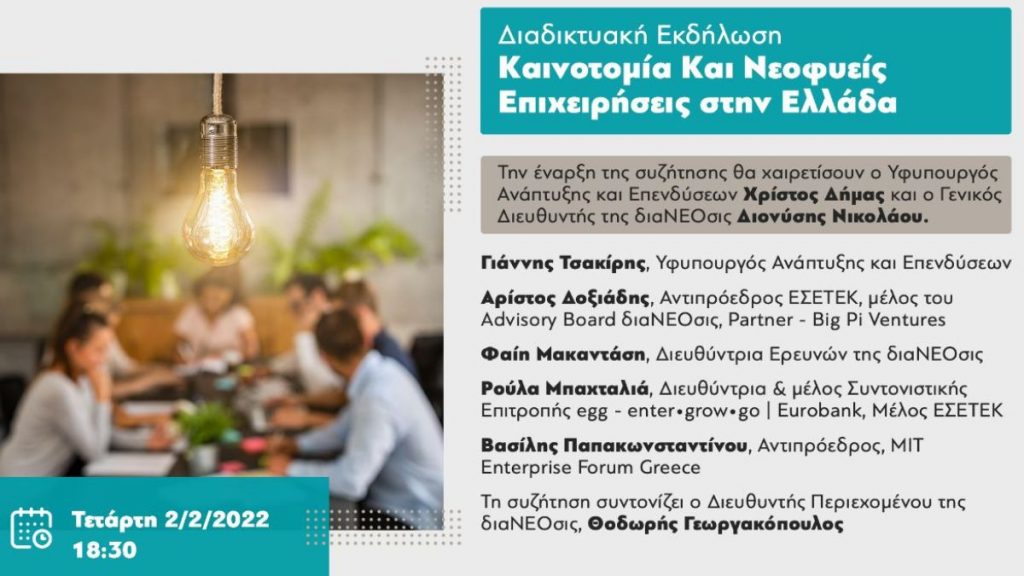 Καινοτομία και Νεοφυείς Επιχειρήσεις στην Ελλάδα που θα πραγματοποιηθεί την Τετάρτη 2/2 στις 18:30 (zoom link) παρουσιάζει η διαΝΕΟσις.