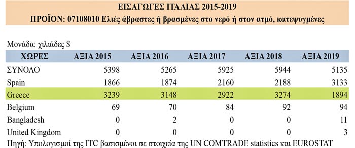 Με μία μέση κατανάλωση που τα τελευταία τρία χρόνια υπολογίζεται σε 124.000 τόνους ετησίως και 2,3 κιλά/έτος κατά κεφαλήν, η αυτάρκεια της Ιταλίας σε επιτραπέζιες ελιές ανέρχεται στο 48,1%. Για να καλύψει το υπόλοιπο ποσοστό, η χώρα εισάγει ποσότητες κυρίως από την Ελλάδα και την Ισπανία. Βάσει των στοιχείων που παραθέτει η έρευνα, το μερίδιο της Ελλάδας την περίοδο 2015-2019 στις ιταλικές εισαγωγές επιτραπέζιων κυμαίνονταν μεταξύ 73%-82%, εξασφαλίζοντας στη χώρα μας σταθερά την πρώτη θέση. Το 2019, ειδικότερα, το 77,49% των συνολικών εισαγωγών της Ιταλίας, στην κατηγορία όσων προορίζονται για χρήσεις άλλες από την ελαιοποίηση, προερχόταν από την Ελλάδα, με το αντίστοιχο ποσοστό της Ισπανίας να αγγίζει το 21,7%. Οι ελληνικές Καλαμών απολαμβάνουν ιδιαίτερη αναγνώριση στο ιταλικό κοινό, ενώ παρουσία στα ράφια των αλυσίδων έχουν επίσης και οι πράσινες (Χαλκιδικής και Θρούμπες Θάσου). Ως επώνυμες ελληνικές συσκευασμένες τοποθετούνται μόνο οι βιολογικές Καλαμών της Γαία. Οι μαύρες ποικιλίες της Ελλάδας διατίθενται ως φυσικές (καθώς δεν προστίθεται χρωματισμός κατά τη γαλακτική ζύμωση), αντίθετα ο τύπος των πράσινων Χαλκιδικής θεωρείται πιο επεξεργασμένος.