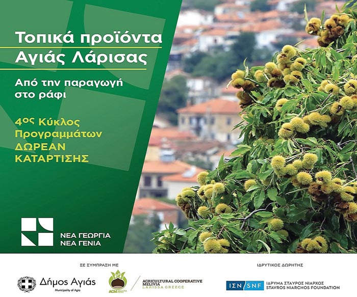 Δωρεάν πρόγραμμα κατάρτισης και συμβουλευτικής, με θέμα «Τοπικά προϊόντα Δήμου Αγιάς: Από την παραγωγή στο ράφι», προσφέρουν ο Οργανισμός «Νέα Γεωργία-Νέα Γενιά», σε συνεργασία με τον Δήμο Αγιάς και τον Αγροτικό Συνεταιρισμό Παραγωγής Εμπορίας Αγροτικών Προϊόντων Μελιβοίας «Η ΑΘΑΝΑΤΗ».