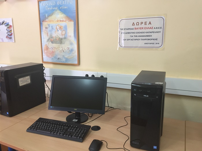 Η Bayer αφουγκραζόμενη τις ανάγκες της κοινωνίας και ανταποκρινόμενη σε αιτήματα που αφορούν την εκπαίδευση και την εξοικείωση των νέων με την τεχνολογία προχώρησε στη δωρεά εξοπλισμού hardware για τη στελέχωση αίθουσας εκμάθησης ηλεκτρονικών υπολογιστών σε δημοτικό σχολείο της περιοχής των Θηβών.