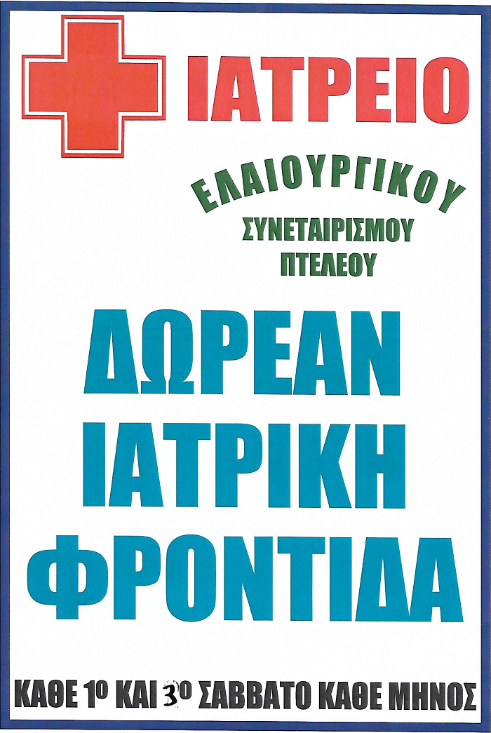 Το Διοικητικό Συμβούλιο του Αγροτικού Ελαιουργικού Συν/σμού Πτελεού ανακοινώνει ότι από την 1η Μαϊου 2017 και κάθε 1ο και 3ο Σάββατο του μήνα, από τις 9 το πρωί έως τις 2 το μεσημέρι, παρέχονται δωρεάν ιατρικές υπηρεσίες στα μέλη από γενικό ιατρό.