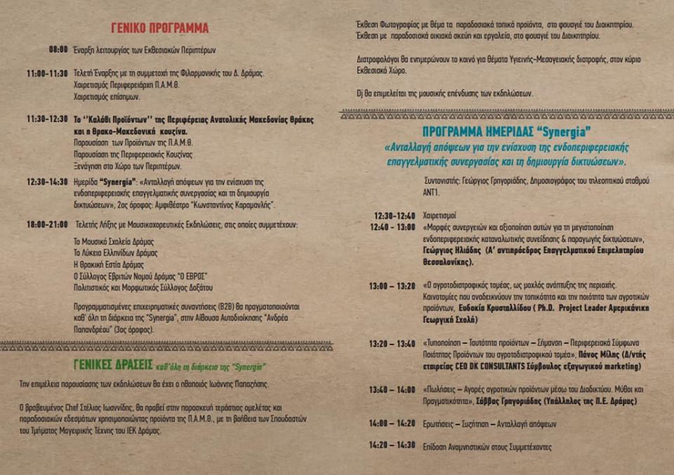 Την 4η Θρακο-Mακεδονική «Synergia» Προώθησης Τοπικών Προϊόντων του διατροφικού τομέα διοργανώνει η Περιφέρεια Ανατολικής Μακεδονίας και Θράκης, το Σάββατο 9 Ιουνίου από τις 8 το πρωί στον περιβάλλοντα χώρο του Διοικητηρίου της Περιφερειακής Ενότητας Δράμας.