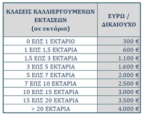 Η συνολική συγχρηματοδοτούμενη ενίσχυση, που προβλέπεται να χορηγηθεί στους δικαιούχους, ανέρχεται σε 126,3 εκατομμύρια ευρώ και αφορά κατ’ αποκοπή εφάπαξ ποσό σύμφωνα με τις ακόλουθες κλάσεις (με βάση την έκταση που αυτοί εμπίπτουν, αθροιστικά για ελιά ελαιοποιήσιμη ή/και διπλής κατεύθυνσης):