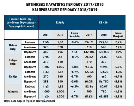 Όπως προκύπτει από την εικόνα για τις τέσσερις βασικές καλλιέργειες σιτηρών (σκληρό και μαλακό σιτάρι, κριθάρι, καλαμπόκι), σε επίπεδο ΕΕ των 28, όλοι σχεδόν οι παραγωγικοί δείκτες δείχνουν ότι η χρονιά που έρχεται θα δοκιμάσει τους Ευρωπαίους αγρότες με μειωμένες στρεμματικές αποδόσεις και όγκους παραγωγής. Αξίζει να σημειωθεί ότι για όλα τα σιτηρά, η πρόβλεψη για φέτος κάνει λόγο για μείωση 6,2% και 7,4%, σε αποδόσεις και ποσότητες αντίστοιχα, σε σχέση με τη σεζόν 2017/2018 ενώ, σε ό,τι αφορά την Ελλάδα, οι οργανώσεις αναμένουν, μεταξύ άλλων, σημαντική πτώση στις εκτάσεις σκληρού σίτου -κάτι στο οποίο προφανώς παίζει τον ρόλο της και η απογοήτευση των παραγωγών από τις κάθε άλλο παρά ικανοποιητικές τιμές.