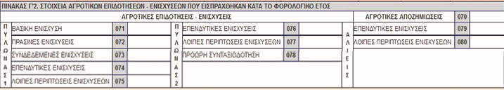 Οι ενισχύσεις αναγράφονται, αρχικά για πληροφοριακούς λόγους, στην πρώτη σελίδα του E3 στον Πίνακα Γ2, ο οποίος είναι προσυμπληρωμένος. Ωστόσο, τα ποσά δεν μεταφέρονται αυτόματα στους επιμέρους κωδικούς, αλλά θα πρέπει να συμπληρωθούν εκεί από τον ίδιο τον αγρότη ή, συνηθέστερα, από τον λογιστή – φοροτεχνικό του. Πιο συγκεκριμένα, το ποσό της βασικής ενίσχυσης (κωδικός 071), καθώς και το άθροισμα των πράσινων (κωδικός 072) και συνδεδεμένων ενισχύσεων (κωδικός 073) που ξεπερνά τα 12.000 ευρώ μεταφέρονται στον κωδικό 362 του Πίνακα Ζ1, αλλά και στον κωδικό 322 του Πίνακα Δ8, ώστε να ληφθούν υπόψη στη διαμόρφωση του κέρδους από αγροτική επιχειρηματική δραστηριότητα.