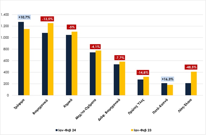 Γράφημα 1. Μεταβολή κυριότερων κλάδων, χωρίς πετρελαιοειδή, Ιανουάριος-Φεβρουάριος 2023/2024