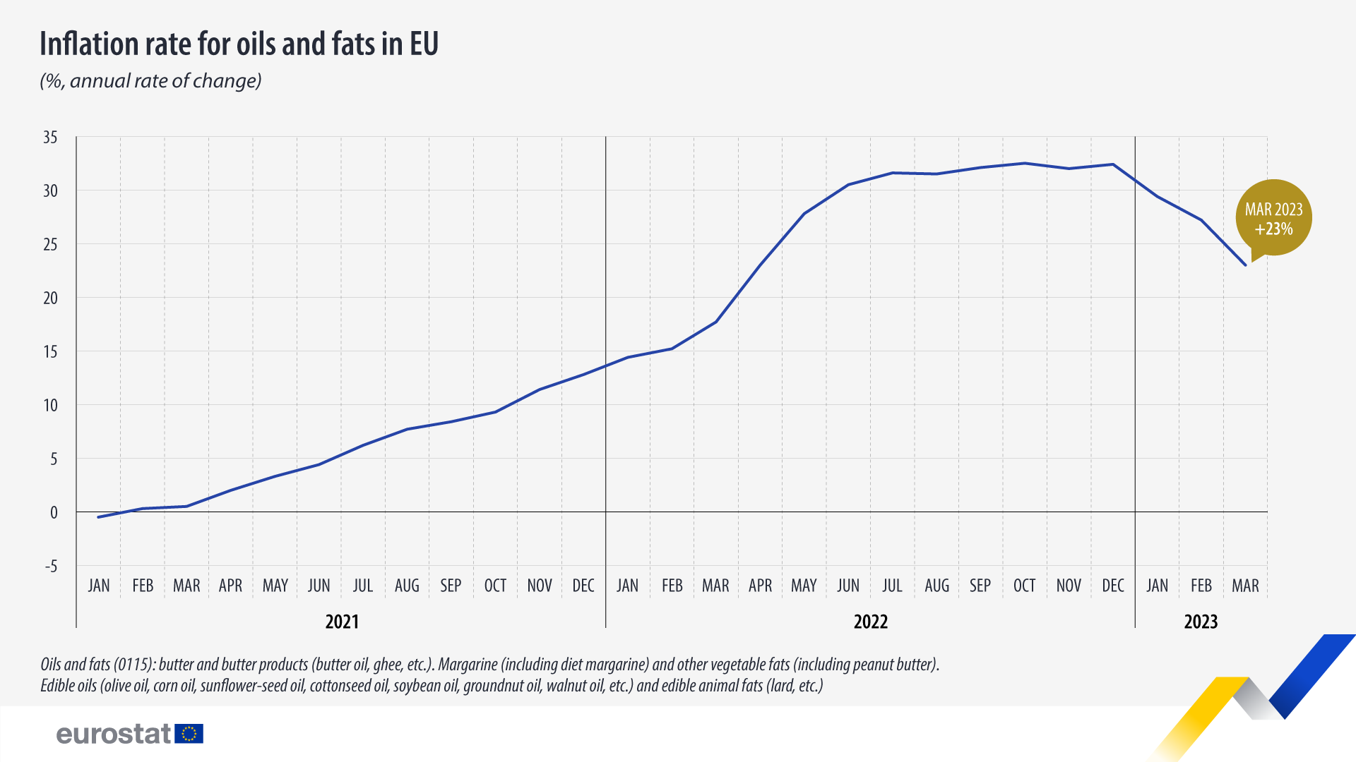 Τα στοιχεία της Κομισιόν, για τον Μάρτιο του 2023 δείχνουν ότι η τιμή των ελαίων και των λιπαρών στην ΕΕ ήταν, κατά μέσο όρο, 23% υψηλότερη από τον Μάρτιο του 2022. Η κορύφωση του ετήσιου ρυθμού μεταβολής σημειώθηκε τον Δεκέμβριο του 2022 (+32% σε σύγκριση με τον Δεκέμβριο του 2021), υποδεικνύοντας μείωση κατά 9 ποσοστιαίες μονάδες (π.μ) κατά τους πρώτους τρεις μήνες του 2023. Αυτό υποδηλώνει ότι ο ρυθμός πληθωρισμού για τα έλαια και τα λίπη αρχίζει να επιβραδύνει.