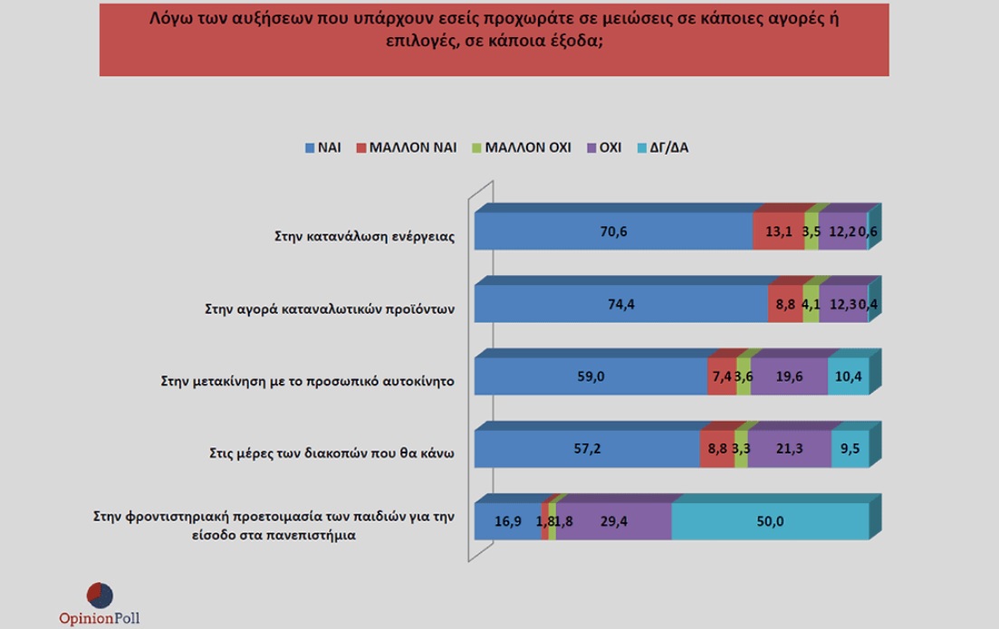 1. Μεγάλο ποσοστό των πολιτών προχωρά σε μειώσεις σε κάποιες αγορές, επιλογές, έξοδα, λόγω της ακρίβειας. Το 83.7% προχωρά σε μειώσεις στην κατανάλωση ενέργειας, το 83.2% στην αγορά καταναλωτικών προϊόντων, το 66.4% στις μετακινήσεις με το προσωπικό αυτοκίνητο και το 66% στις μέρες των διακοπών. Επίσης ένα 18.7% κάνει κάποιες περικοπές όσον αφορά στην φροντιστηριακή προετοιμασία των παιδιών τους για την είσοδο στα Α.Ε.Ι.