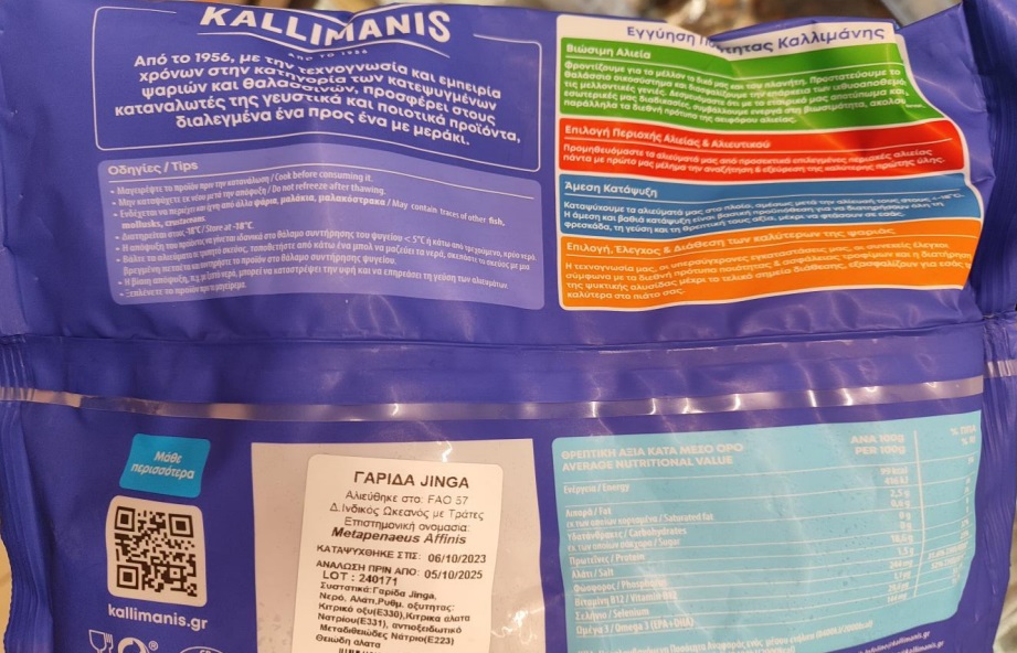 Ο Ε.Φ.Ε.Τ. και ειδικότερα η Περιφερειακή Διεύθυνση Κεντρικής Μακεδονίας, κατά τη διενέργεια ελέγχων στο πλαίσιο του Προγράμματος «Επίσημος Έλεγχος Μικροβιολογικών Κριτηρίων Ασφάλειας Τροφίμων» έτους 2024, προέβη σε δειγματοληψία κατεψυγμένου προϊόντος με τα στοιχεία: ΓΑΡΙΔΕΣ ΓΙΓΑΣ (JINGA) ΑΠΟΦΛΟΙΩΜΕΝΕΣ ΠΡΟΒΡΑΣΜΕΝΕΣ ΧΩΡΙΣ ΕΝΤΕΡΟ ΒΑΘΕΙΑΣ ΚΑΤΑΨΥΞΗΣ – KALLIMANIS, καθαρού βάρους 350 γρ., με ημερομηνία κατάψυξης 06/10/2023, ημερομηνία ανάλωσης 05/10/2025 και αριθμό παρτίδας / LOT 240171, που παράγεται από την εταιρεία «DARDANEL GREECE ΜΟΝ. Α.Ε.». Σε συνέχεια εργαστηριακών αναλύσεων στο εργαστήριο Δοκιμών & Ερευνών Τροφίμων Θεσσαλονίκης του ΕΦΕΤ, διαπιστώθηκε η παρουσία του παθογόνου μικροοργανισμού Salmonella spp. στο ανωτέρω δείγμα.