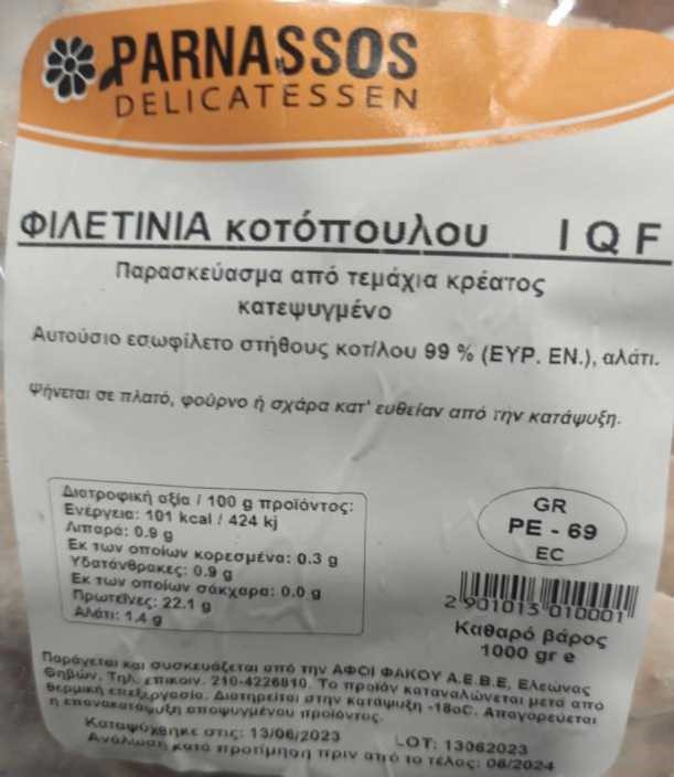Επίσης, ο ΕΦΕΤ, κατά τη διενέργεια ελέγχων στο πλαίσιο του Προγράμματος «Επίσημος Έλεγχος Μικροβιολογικών Κριτηρίων Ασφάλειας Τροφίμων» έτους 2023, προέβη σε δειγματοληψία του προϊόντος, «ΦΙΛΕΤΙΝΙΑ ΚΟΤΟΠΟΥΛΟΥ IQF PARNASSOS DELICATESSEN κατεψυγμένο», καθ. βάρους 1000g, αριθ. παρτίδας: 13062023, ημ. ανάλωσης κατά προτίμηση πριν από το τέλος: 06/2024, που παρασκευάζεται από την εταιρεία «ΑΦΟΙ ΦΑΚΟΥ ΑΕΒΕ», στον Ελαιώνα Θηβών.