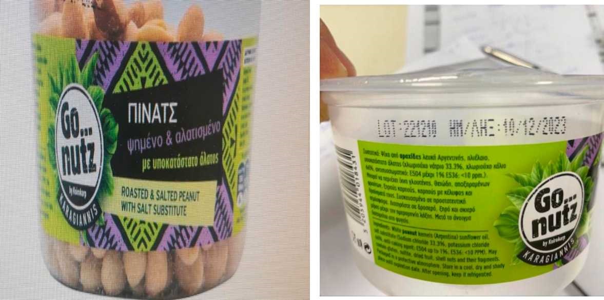 Ο Ε.Φ.Ε.Τ. και ειδικότερα η Περιφερειακή Διεύθυνση Αττικής του Ε.Φ.Ε.Τ., κατά τη διενέργεια επιθεώρησης στο πλαίσιο διερεύνησης αναφοράς καταναλωτή, προέβη σε έλεγχο του τροφίμου «Go Nutz- KARAGIANNIS, Πίνατς-Ψημένα και αλατισμένα με υποκατάστατο άλατος» των 220g με στοιχεία: ημερομηνία λήξης: 10/12/23 και LOT 221210. To προϊόν επεξεργάζεται και συσκευάζεται στην Ελλάδα από την «ΧΡΗΣΤΟΣ ΔΗΜ.ΚΑΡΑΓΙΑΝΝΗΣ Α.Ε.Β.Ε», (ΞΗΡΟΚΑΡΠ), 4ο χλμ Αμφιλοχίας-Αγρινίου και διακινείται από τη ΜΕΤΡΟ (My Market). Μετά από μακροσκοπικό έλεγχο διαπιστώθηκε η παρουσία νεκρών προνυμφών και υφών τους μέσα στη συσκευασία.