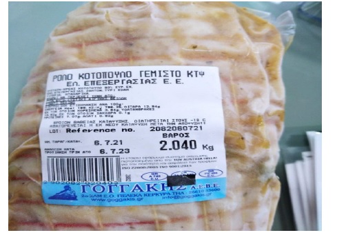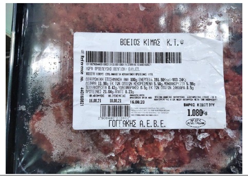 Α) «ρολό κοτόπουλο γεμιστό κτψ, Ελλην. Επεξεργασίας», με ημερομηνία παραγωγής 6.7.21 και ημερομηνία ανάλωσης «κατά προτίμηση πριν από 6.7.23», βάρους 2 kg περίπου. Β) «βόειος κιμάς κτψ, προέλευσης Βελγίου, Ελλην. επεξεργασίας», με ημερομηνία συσκευασίας 18.08.21 και ημερομηνία ανάλωσης «κατά προτίμηση πριν από 16.08.23», βάρους 1 kg περίπου. Στα κρεατοσκευάσματα αυτά διαπιστώθηκε, από το Εργαστήριο Δοκιμών Τροφίμων Αθήνας του ΕΦΕΤ η παρουσία του παθογόνου βακτηρίου Salmonella spp.