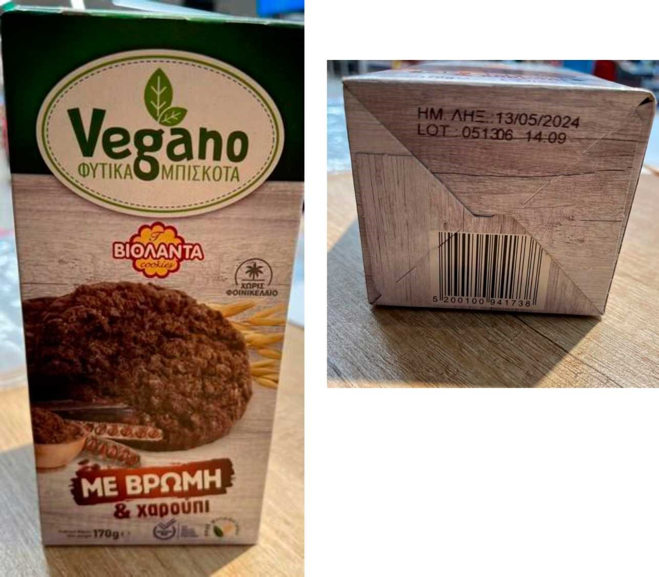 Ο Ε.Φ.Ε.Τ. και ειδικότερα η Περιφερειακή Διεύθυνση Κεντρικής Μακεδονίας, κατά τη διενέργεια ελέγχων στο πλαίσιο του Προγράμματος «Επίσημος Έλεγχος για την παρουσία αλλεργιογόνων ουσιών σε ορισμένα είδη τροφίμων» έτους 2023, προέβη σε δειγματοληψία τροφίμου με στοιχεία: «ΜΠΙΣΚΟΤΑ VEGANO, ΜΕ ΒΡΩΜΗ ΚΑΙ ΧΑΡΟΥΠΙ» με την επωνυμία «ΒΙΟΛΑΝΤΑ VEGANO ΦΥΤΙΚΑ ΜΠΙΣΚΟΤΑ», με ημερομηνία ελάχιστης διατηρησιμότητας 13-05-2024 και αριθμό παρτίδας lot 051306, που παράγεται από την εταιρεία «Βιομηχανία Μπισκότων Βιολάντα Α.Ε.», με έδρα το 6ο χιλ. Τρικάλων – Καρδίτσας.