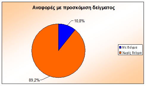 Μόλις το 10,8% των καταγγελιών έγινε με προσκόμιση δείγματος ενώ το 89,2% έγινε χωρίς την προσκόμιση δείγματος. Στο σημείο αυτό, αξίζει να επισημανθεί η σημασία του δείγματος καθώς αυτό διευκολύνει σημαντικά τη διερεύνηση της καταγγελίας.