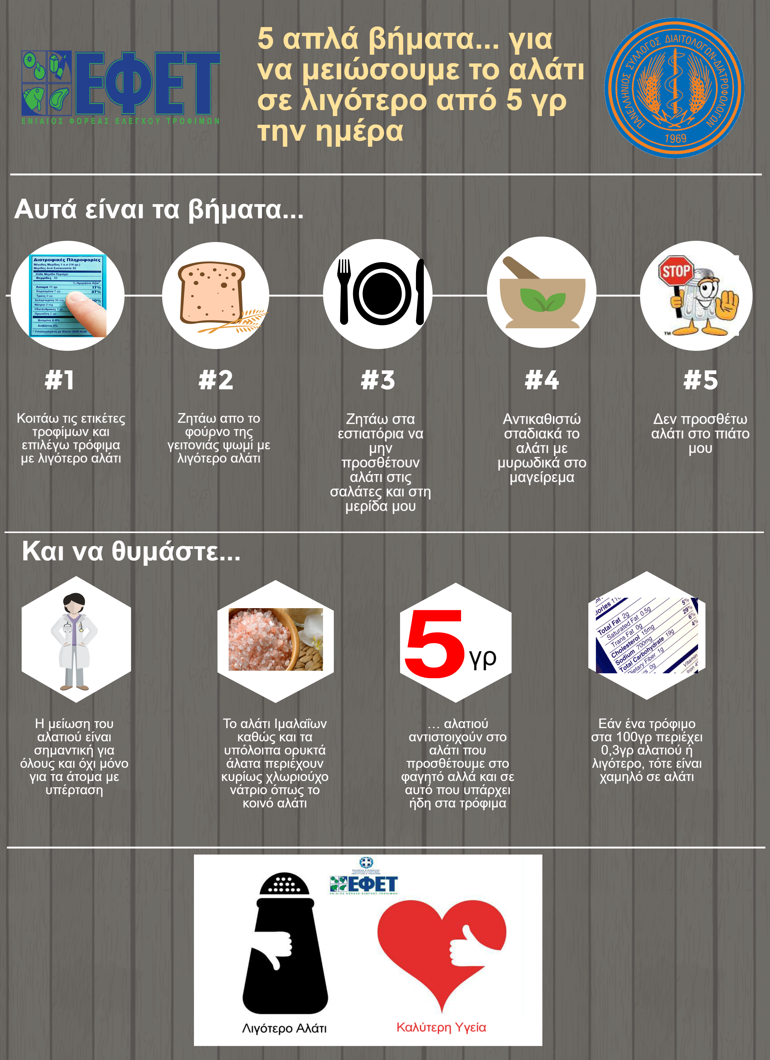 Ο ΕΦΕΤ την τελευταία δεκαετία έχει προβεί σε διάφορες δράσεις ευαισθητοποίησης, τόσο του γενικού πληθυσμού όσο και μεμονωμένων πληθυσμιακών ομάδων για την αναγκαιότητα μείωσης αλατιού (σποτ στο μετρό Αττικής, ημερίδα αποκλειστικά για τη μείωση αλατιού, διαλέξεις σε σχολεία της Χώρας κλπ), ενώ έχει υπογράψει πρωτόκολλα συνεργασίας, τόσο με την Λέσχη Αρχιμαγείρων Ελλάδας όσο και με την Ομοσπονδία Αρτοποιών Ελλάδας, με στόχο τη μείωση της περιεκτικότητας αλατιού στα γεύματα και στο ψωμί αντίστοιχα.
