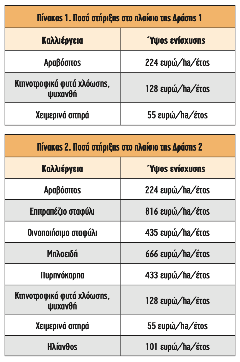Τα ποσά στήριξης, στο πλαίσιο της δράσης, για ορισμένες καλλιέργειες, καθώς προστίθεται, πλέον, και η καλλιέργεια του ηλίανθου, παρατίθενται στον Πίνακα 2.