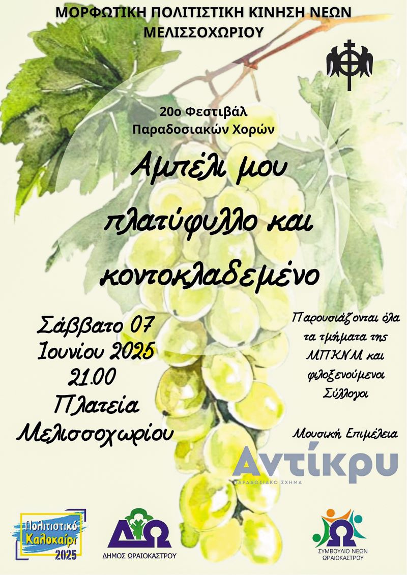 Ακόμη μια πολύχρωμη σελίδα της παράδοσής του ανοίγει το Μελισσοχώρι Θεσσαλονίκης με μια εκδήλωση που τιμά το αμπέλι, το κρασί, την εποχή του τρύγου, αλλά και τον μόχθο. Αυτό το ιδιαίτερο γεγονός μας καλεί να βιώσουμε μια μουσικοχορευτική παράσταση που διοργανώνει η Μορφωτική Πολιτιστική Κίνηση Νέων Μελισσοχωρίου, η οποία επιχειρεί μέσα από τους στροβιλισμούς του χορού να μεταδώσει ιστορίες παλαιότερων εποχών της περιοχής. Ο τίτλος της εκδήλωσης είναι «Αμπέλι μου πλατύφυλλο και πολυκλαδεμένο» και, όπως προαναγγέλλεται, θα γίνει μια προσπάθεια να συνδεθεί αυτό το σύμβολο της γης και των καρπών του με αυτόν της παράδοσης και της ιστορίας του Μελισσοχωρίου, που από… κάποιο μεταφραστικό λάθος αποσυνδέθηκε από το αγροτικό παρελθόν του.