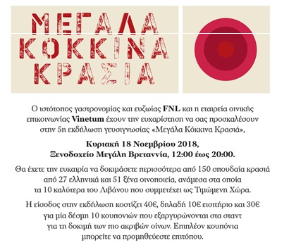 Εκδήλωση γευσιγνωσίας «Μεγάλα Κόκκινα Κρασιά» διοργανώνεται την Κυριακή 18 Νοεμβρίου σε κεντρικό ξενοδοχείο της Αθήνας και στην οποία θα παρουσιαστούν περισσότερα από 150 σπουδαία κρασιά, από 27 ελληνικά και 51 ξένα οινοποιεία.