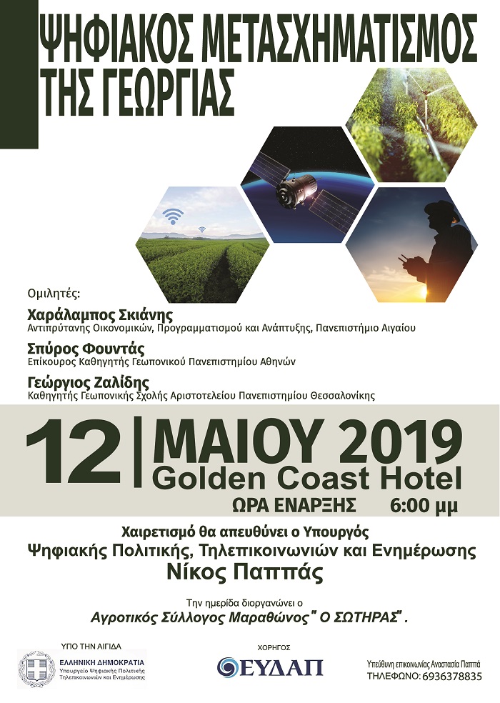 Εκδήλωση με θέμα «Ψηφιακός μετασχηματισμός της γεωργίας», διοργανώνει ο Αγροτικός Σύλλογος Μαραθώνος «Ο Σωτήρας», την Κυριακή 12 Μαΐου και ώρα 18:00 στην αίθουσα συνεδρίων του ξενοδοχείου Golden Coast στον Μαραθώνα με ομιλητές τους Χαράλαμπο Σκιάνη, Αντιπρύτανης Οικονομικών, Προγραμματισμού και Ανάπτυξης στο Πανεπιστήμιο Αιγαίου, Σπύρο Φουντά, Επίκουρος Καθηγητή στο Γεωπονικό Πανεπιστήμιο Αθηνών και Γεώργιο Ζαλίδη, Καθηγητής Γεωπονικής Σχολής του Αριστοτελείου Πανεπιστημίου Θεσσαλονίκης.
