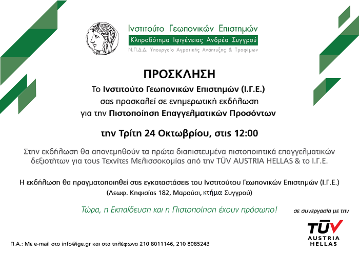 Εκδήλωση για την Πιστοποίηση Επαγγελματικών Προσόντων διοργανώνει το Ι.Γ.Ε. την Τρίτη 24 Οκτωβρίου 2017 από τις 12:00 έως τις 14:00 το μεσημέρι. Στην εκδήλωση, που θα πραγματοποιηθεί στις εγκαταστάσεις του Ινστιτούτου Γεωπονικών Επιστημών (Λ. Κηφισίας 182, Μαρούσι), θα απονεμηθούν και τα πρώτα διαπιστευμένα πιστοποιητικά στους πρώτους επιτυχόντες Τεχνίτες Μελισσοκομίας.