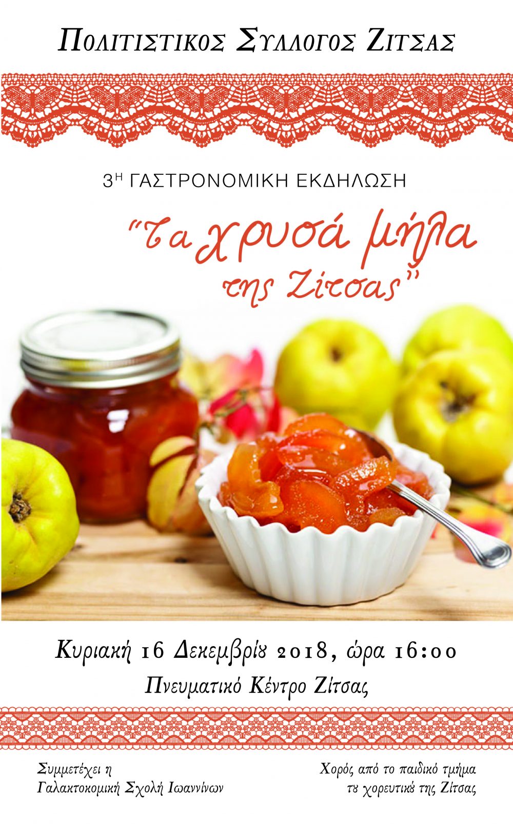 O Πολιτιστικός Σύλλογος Ζίτσας θα πραγματοποιήσει την Κυριακή 16 Δεκεμβρίου 2018 στις 16:00, στο Πνευματικό Κέντρο Ζίτσας, την 3η Γαστρονομική Εκδήλωση- “Τα χρυσά μήλα της Ζίτσας”.