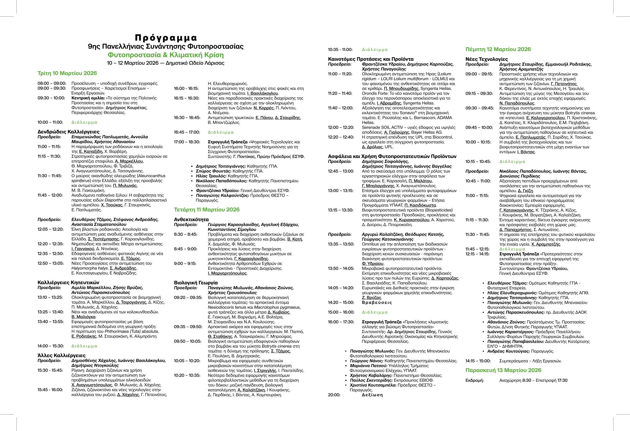 Η 9η Πανελλήνια Συνάντηση Φυτοπροστασίας με θέμα «Φυτοπροστασία & Κλιματική Κρίση» θα πραγματοποιηθεί από τις 10 έως τις 12 Μαρτίου 2026 στην Αίθουσα του Δημοτικού Ωδείου Λάρισας, στη Λάρισα.