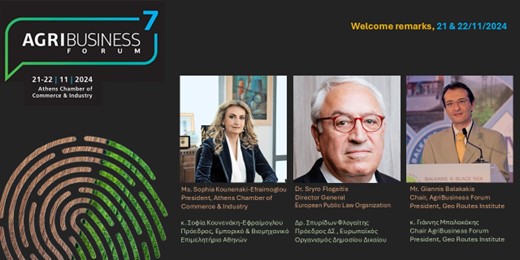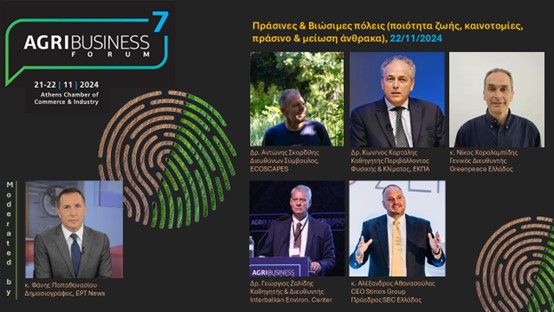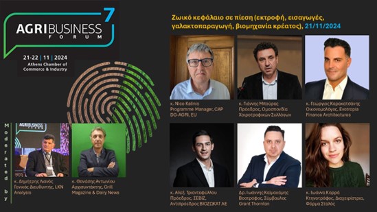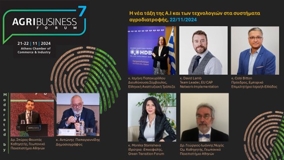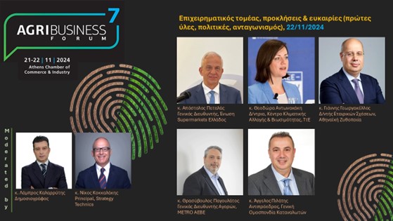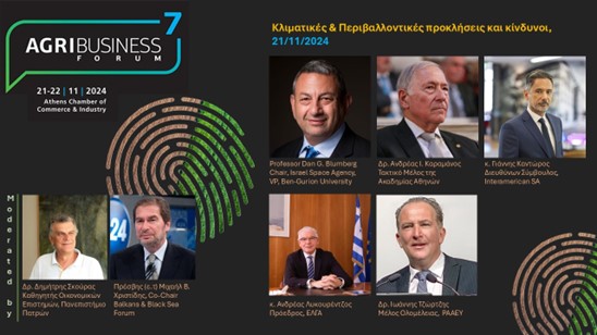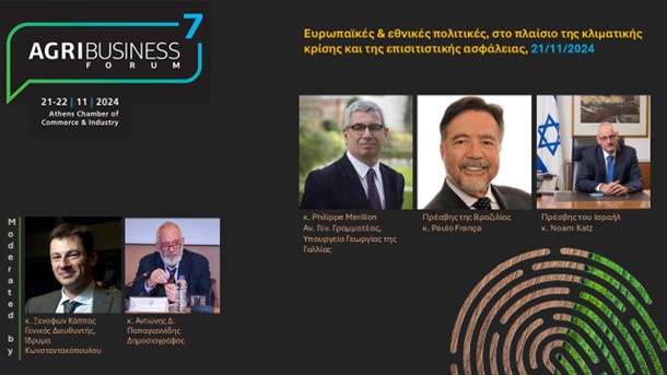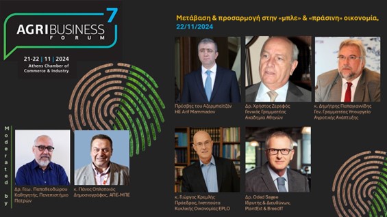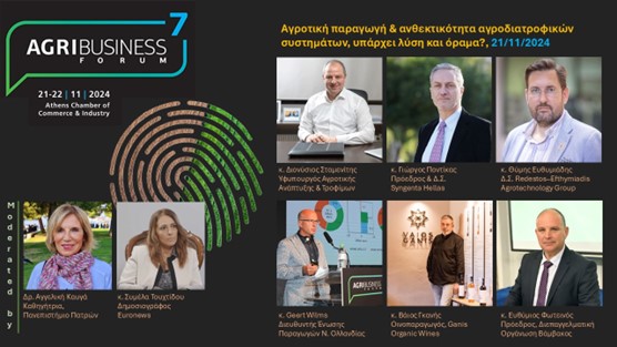 Το 7ο διεθνές AgriBusiness Forum, με θέμα «Quo Vadis Greek & European agriculture» στην ψηφιακή εποχή, λαμβάνει χώρα στις 21-22 Νοεμβρίου 2024, στο Εμπορικό & Βιομηχανικό Επιμελητήριο Αθηνών, με σημαντικό αριθμό εκπροσώπων από επιχειρήσεις, παραγωγούς, διπλωμάτες, ακαδημαϊκούς, και υπεύθυνους χάραξης πολιτικής.