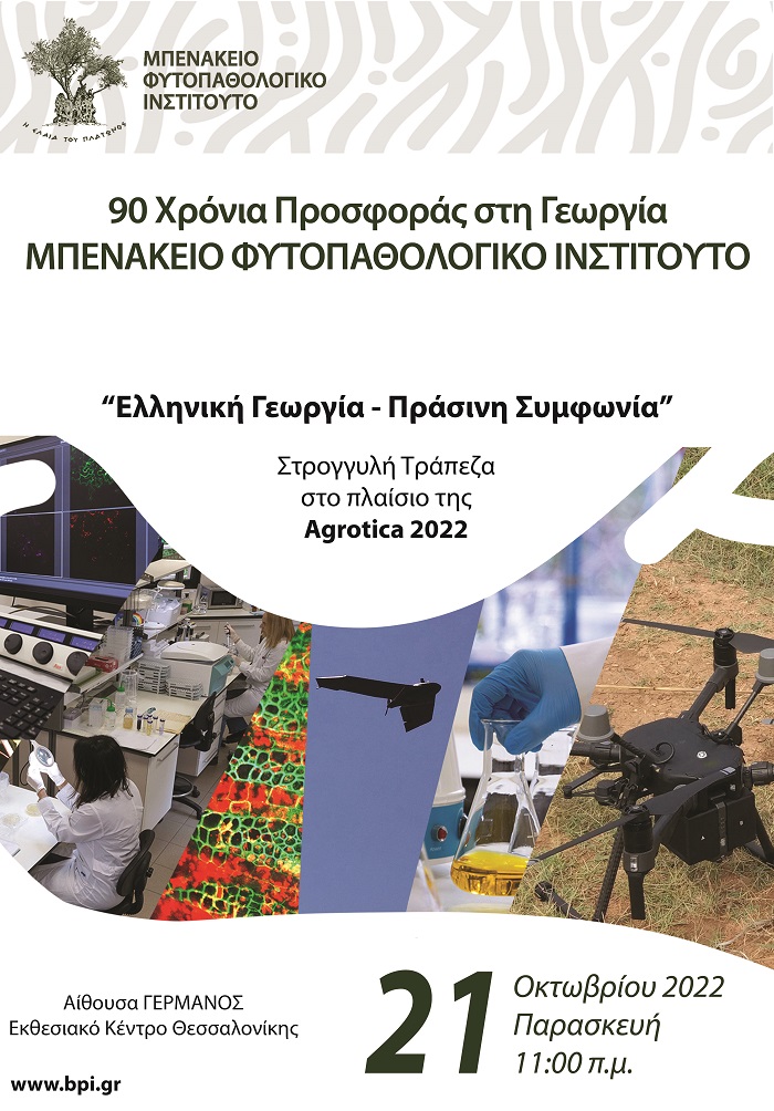 To Μπενάκειο Φυτοπαθολογικό Ινστιτούτο στο πλαίσιο της Agrotica 2022 διοργανώνει, την Παρασκευή 21 Οκτωβρίου 2022 την εκδήλωση με τίτλο: «ΜΠΕΝΑΚΕΙΟ ΦΥΤΟΠΑΘΟΛΟΓΙΚΟ ΙΝΣΤΙΤΟΥΤΟ – 90 Χρόνια Προσφοράς στη Γεωργία».
