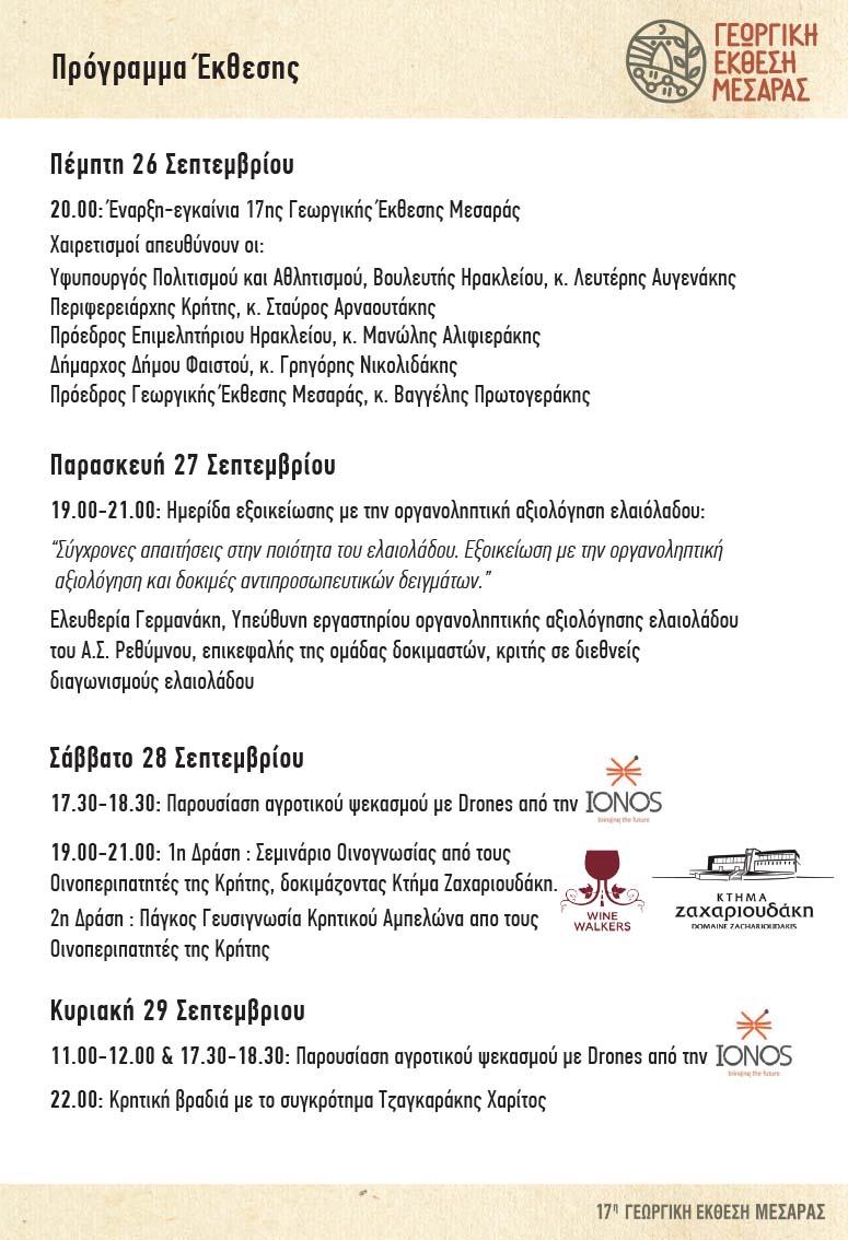 Ολοκληρώθηκαν οι προετοιμασίες για την 17η Γεωργική Έκθεση Μεσαράς, η οποία άνοιξε τις πύλες της την Πέμπτη 26 Σεπτεμβρίου και θα διαρκέσει έως την Κυριακή 29 Σεπτεμβρίου 2019 στο Εκθεσιακό Κέντρο στους Βώρους του Δήμου Φαιστού. Το ωράριο λειτουργίας της Έκθεσης είναι από Πέμπτη έως Σάββατο 17.00-22.00 και την Κυριακή 10.00-14.00 και 17.00-22.00.