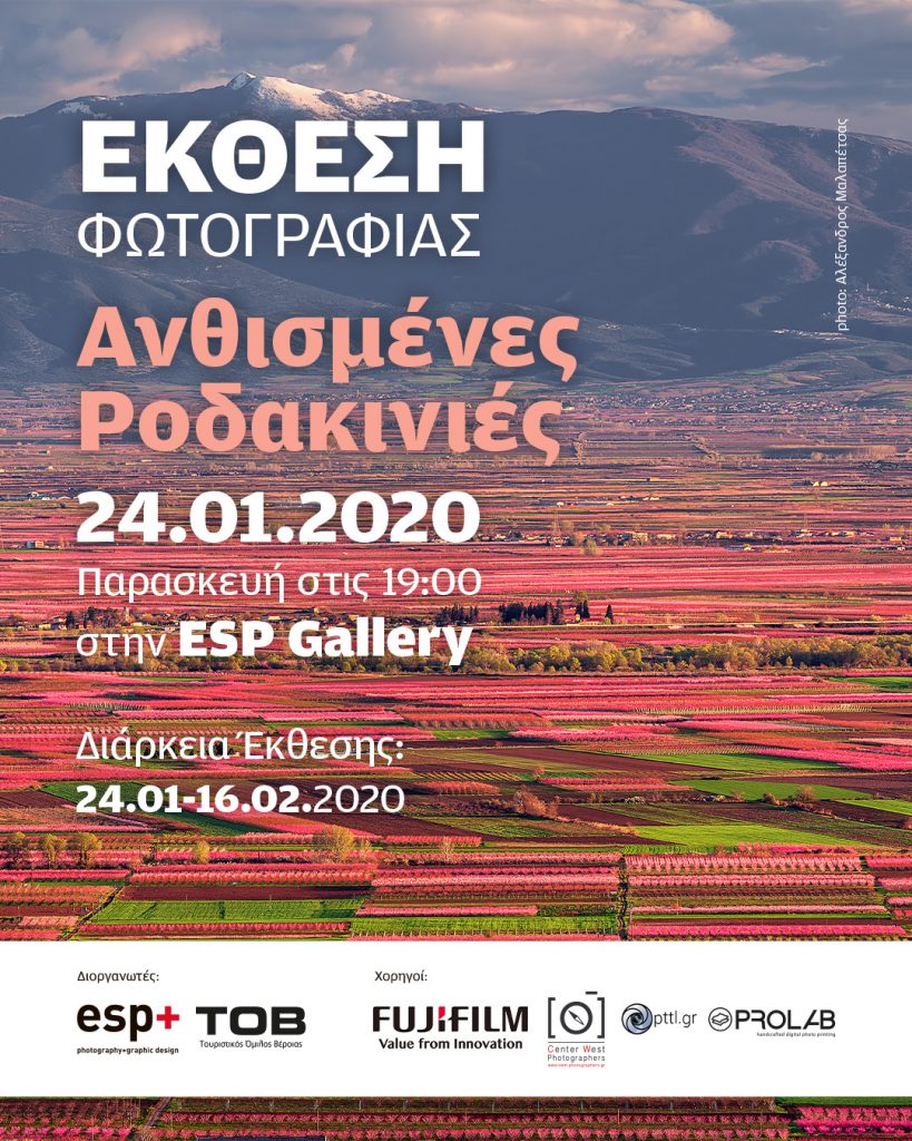 Ο Τουριστικός Όμιλος Βέροιας και το ΙΕΚ ESP παρουσιάζουν την έκθεση φωτογραφίας «Ανθισμένες Ροδακινιές». Από την Παρασκευή 24 Ιανουαρίου ως τις 16 Φεβρουαρίου 2020, οι εικόνες του ολάνθιστου ροζ κάμπου της Βέροιας φιλοξενούνται στην ESP Gallery (Ναυμαχίας Έλλης 5 – Λαδάδικα) δίνοντας ανοιξιάτικο χρώμα και διάθεση στην πόλη της Θεσσαλονίκης.